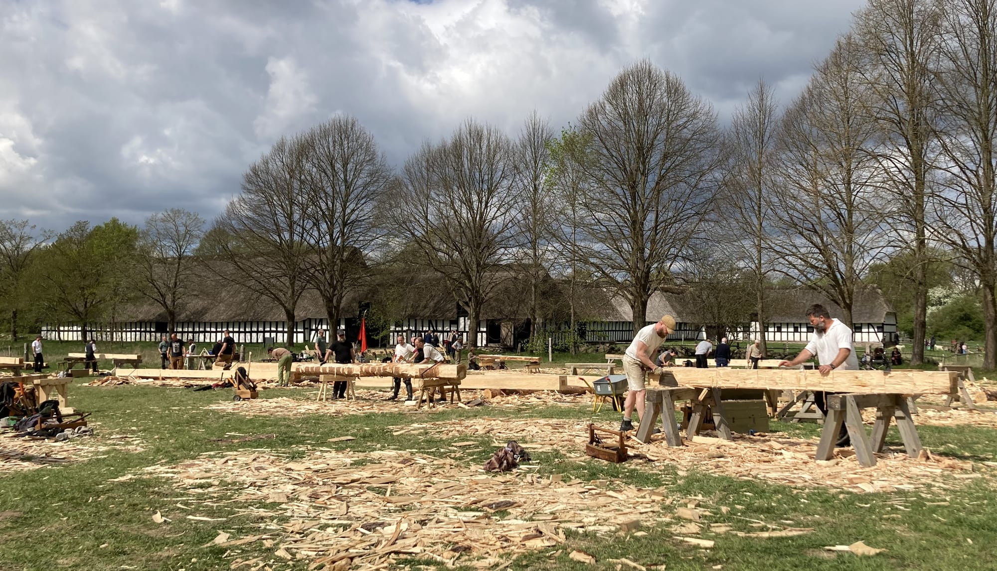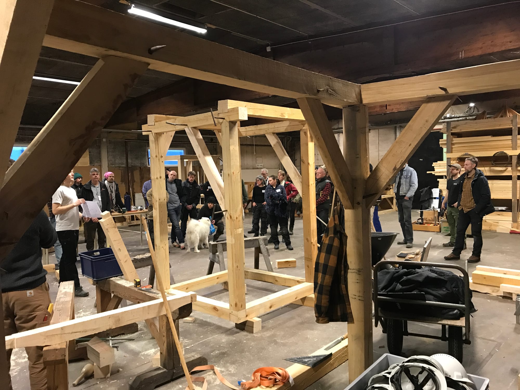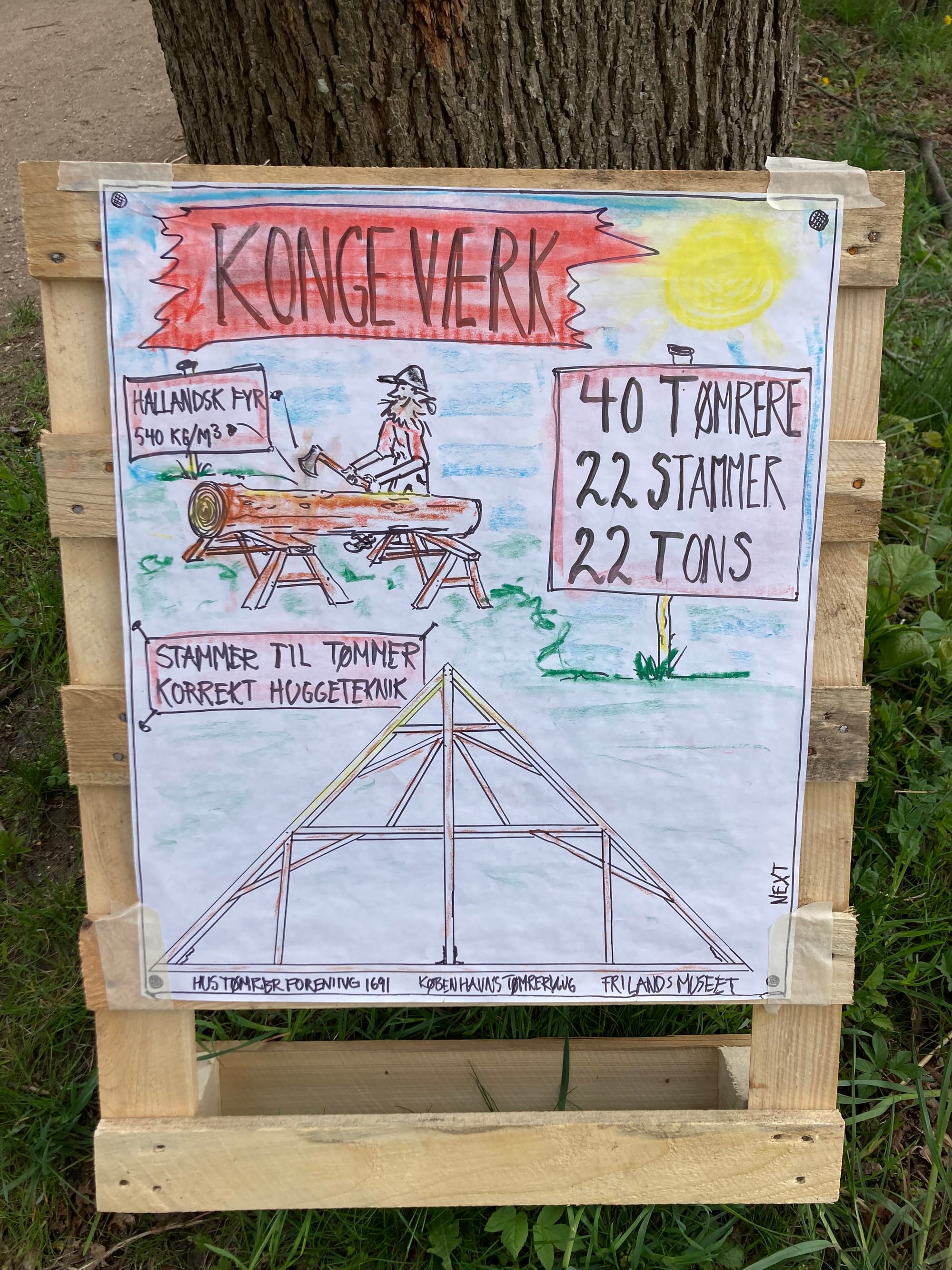 Många av våra medlemmar var i våras delaktiga i att hugga timmer till projektet Kongeværk, en rekonstruktion av en av de stora takstolarna från Børsen i København. Projektet har tyvärr stått still under sommaren och första delen av hösten, men nu planerar vi för fullt del 2, där takstolen ska påritas och huggas under en veckas tid våren 2026.