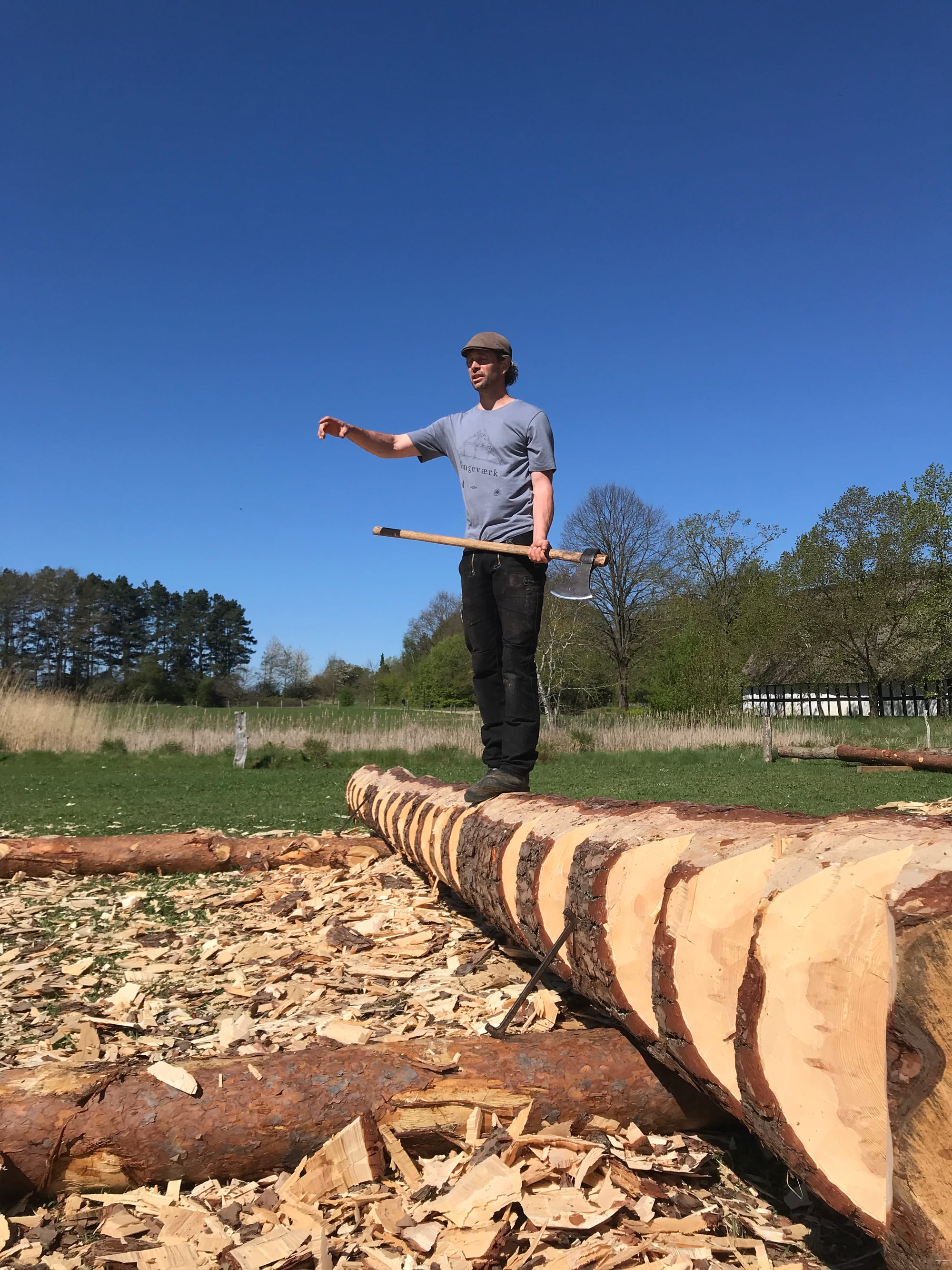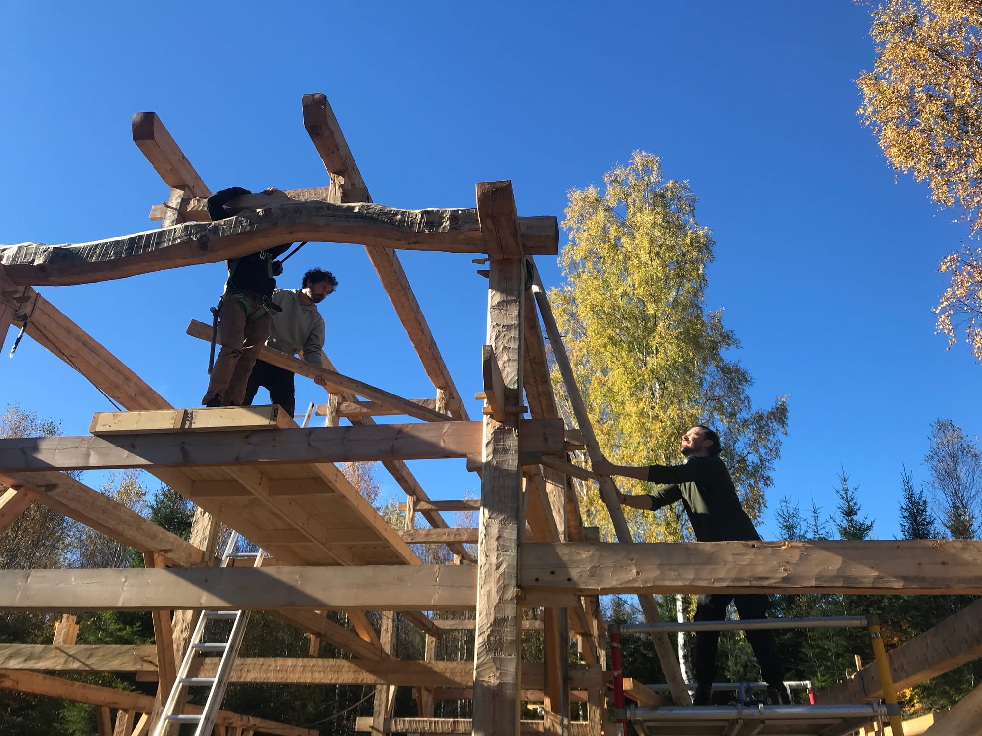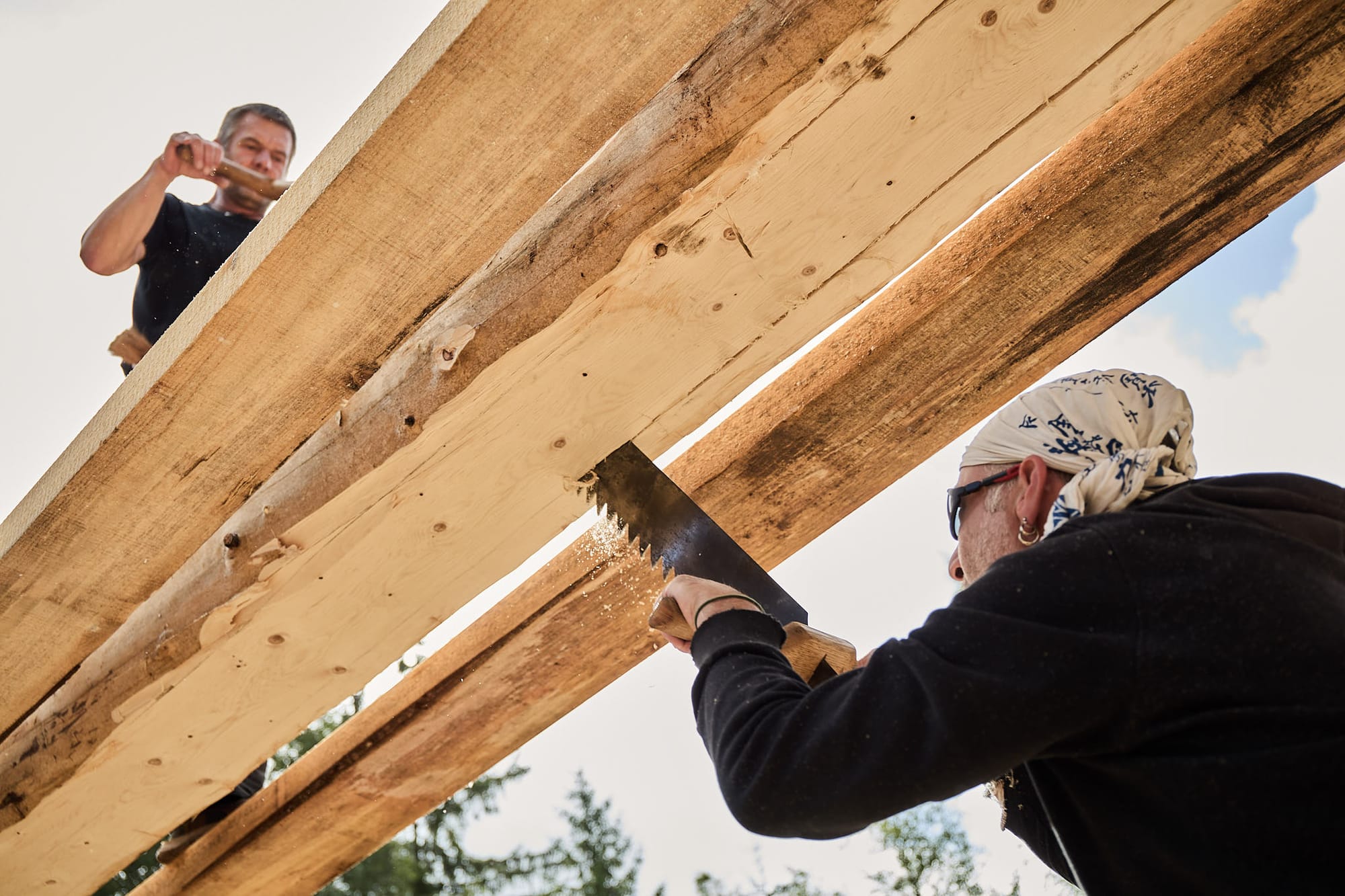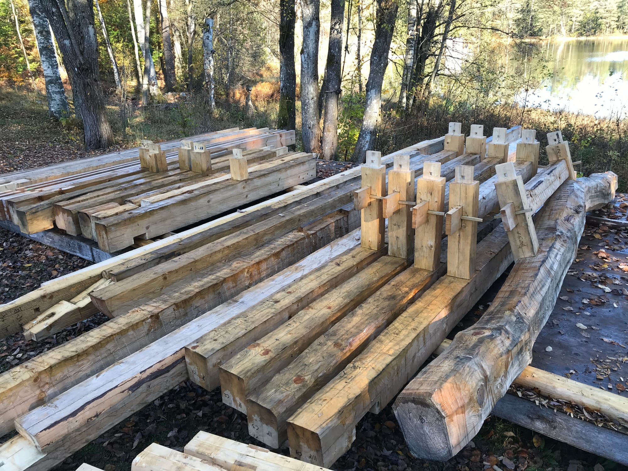 Den 3:e augusti drog det hela igång där alla hantverkare efter en kort introduktion drog fram sina yxor och kransågar och högg in på timret. Det var en blandning av fur och gran som var fällt i närområdet, och redan dag två i projektet kunde vi börja med att skarva ihop de franska låsen som användes i de europeiska högremsväggarna.