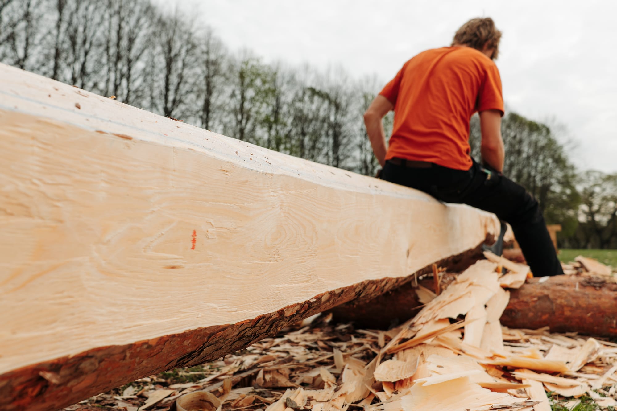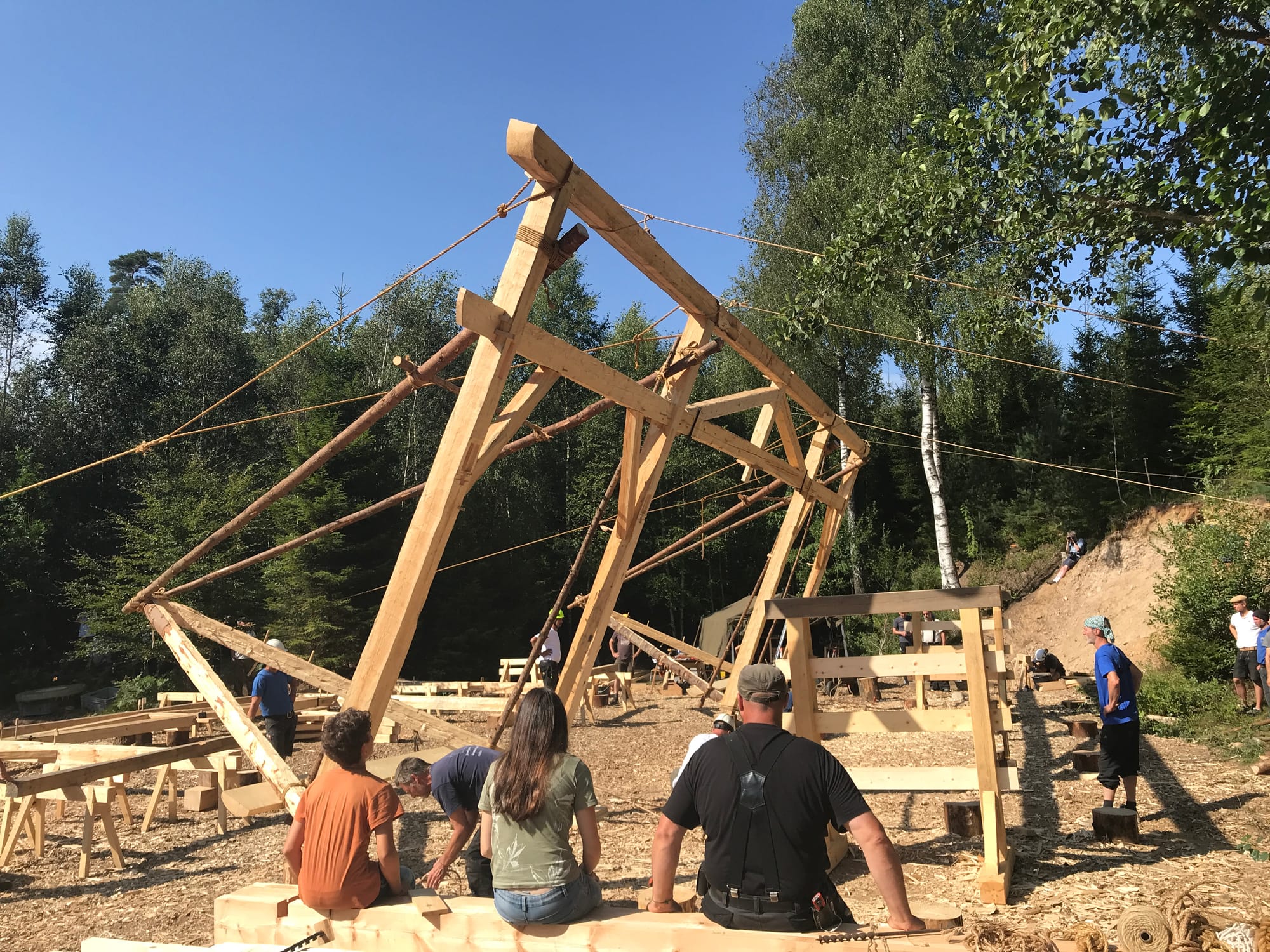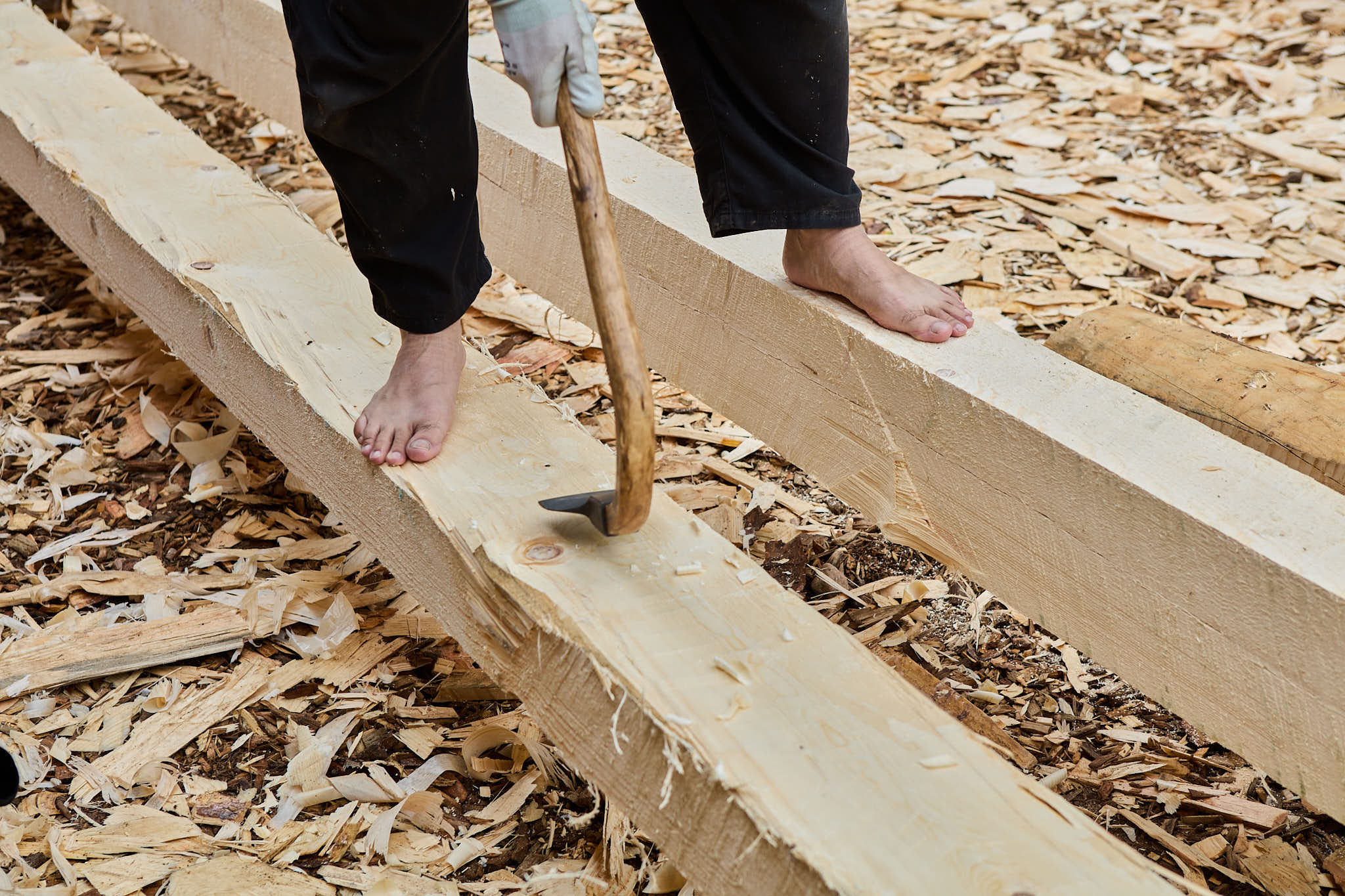 Den 3:e augusti drog det hela igång där alla hantverkare efter en kort introduktion drog fram sina yxor och kransågar och högg in på timret. Det var en blandning av fur och gran som var fällt i närområdet, och redan dag två i projektet kunde vi börja med att skarva ihop de franska låsen som användes i de europeiska högremsväggarna.