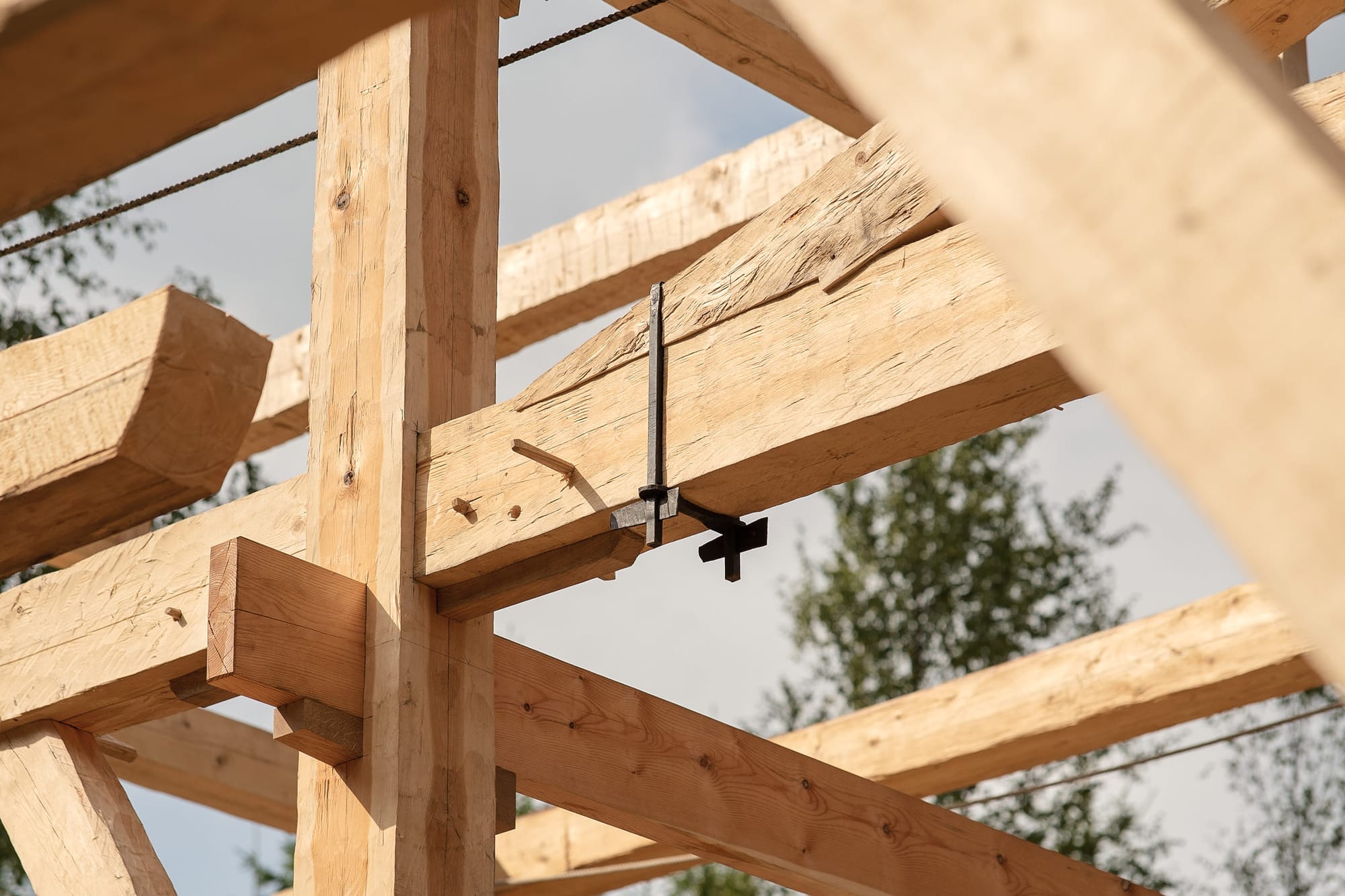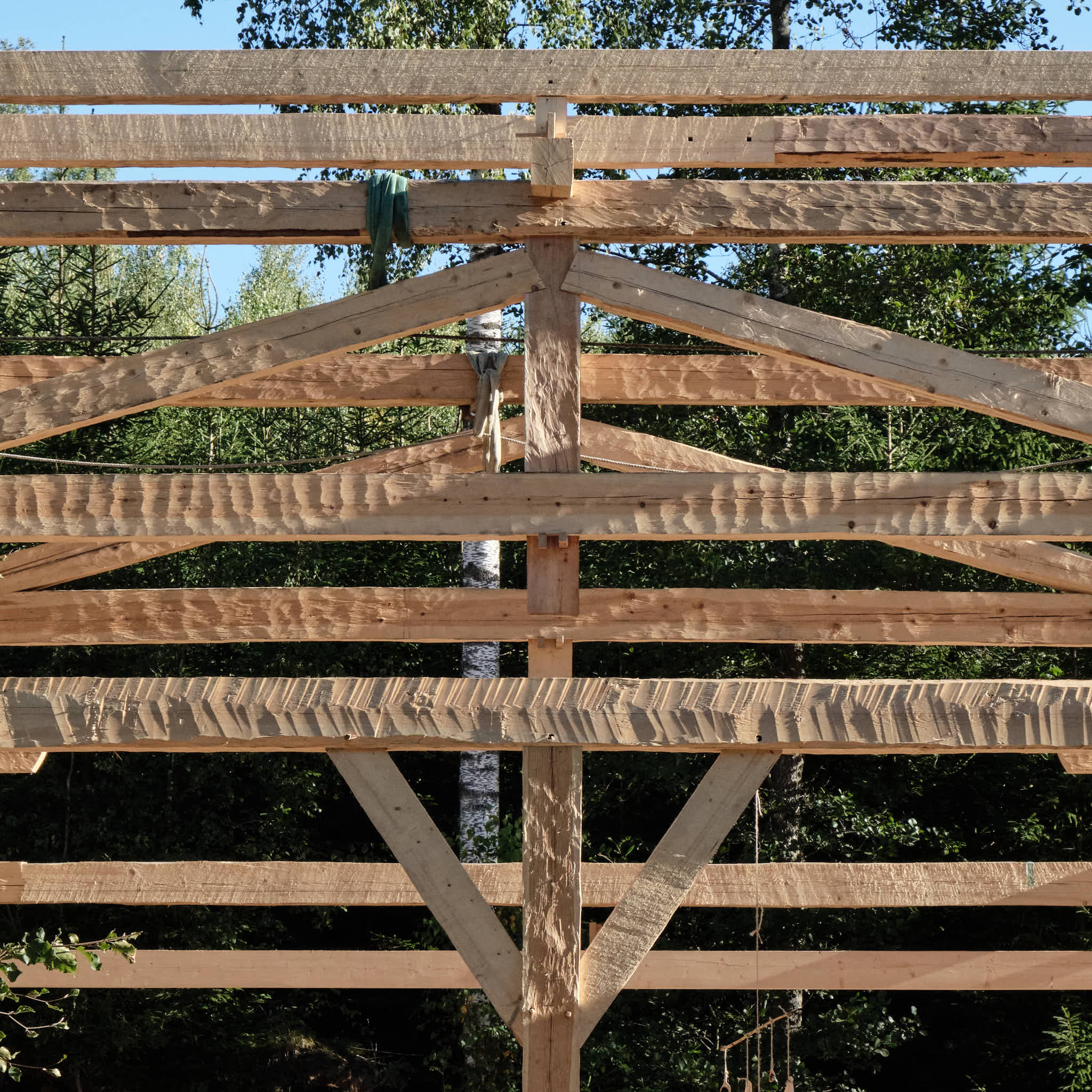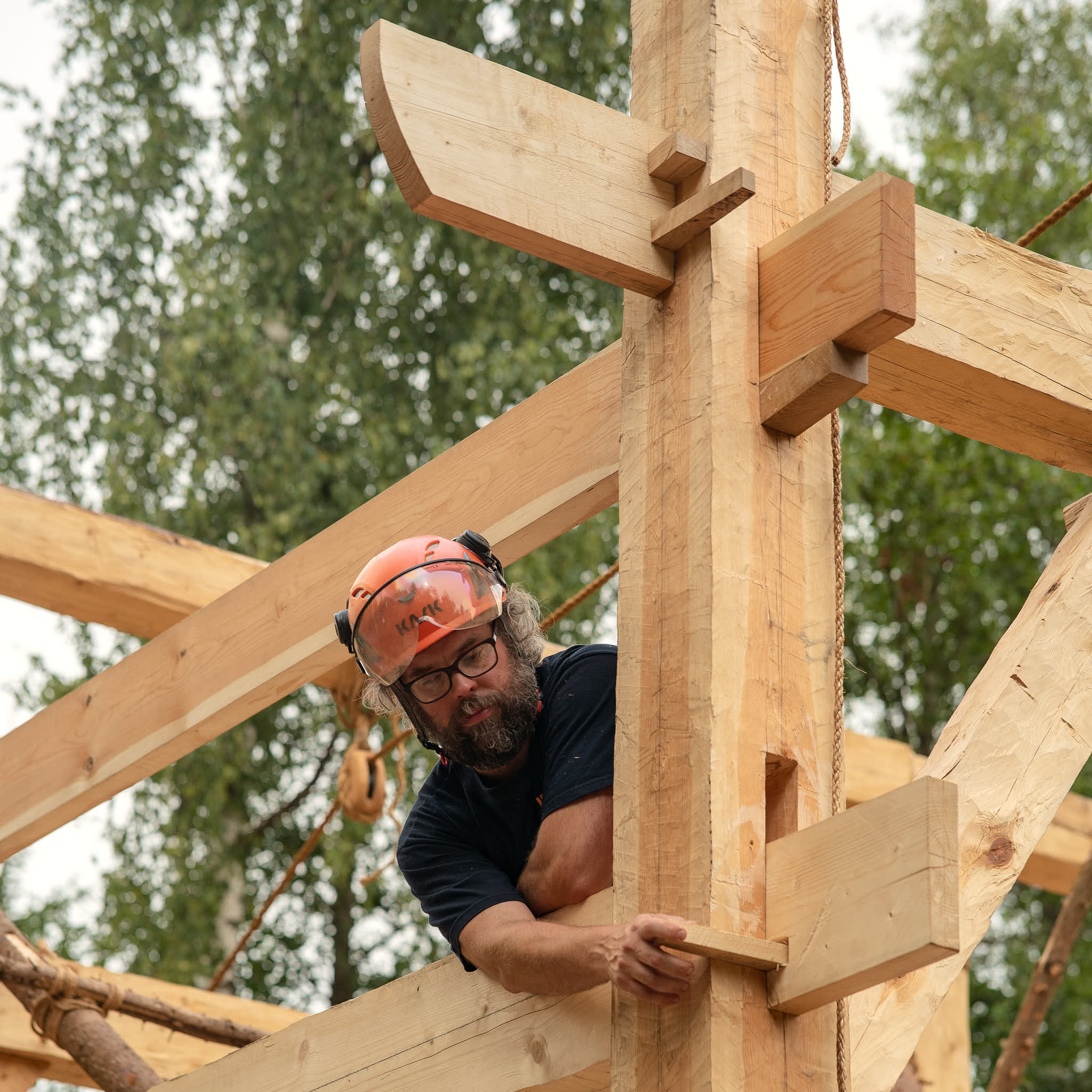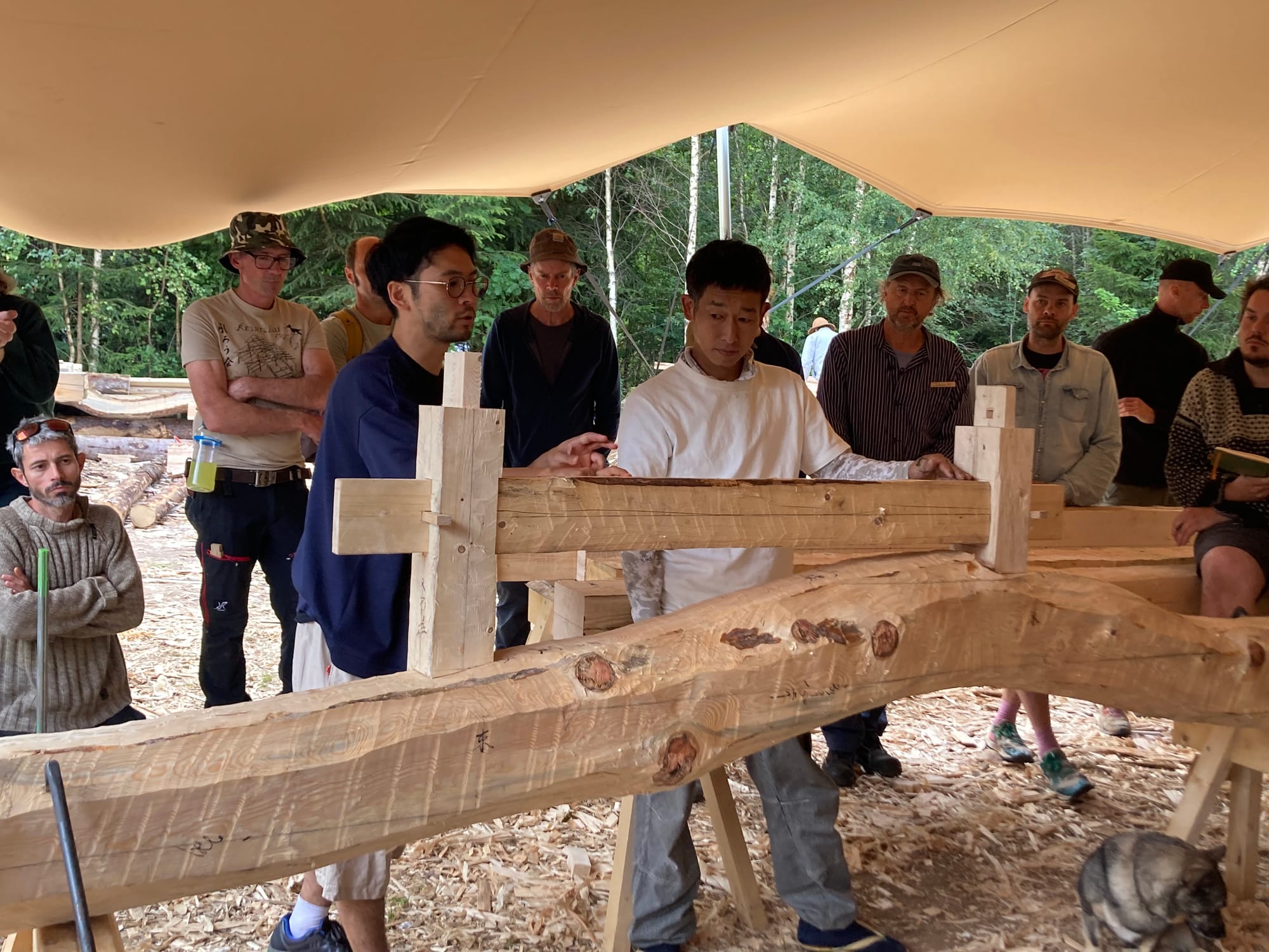 Den 3:e augusti drog det hela igång där alla hantverkare efter en kort introduktion drog fram sina yxor och kransågar och högg in på timret. Det var en blandning av fur och gran som var fällt i närområdet, och redan dag två i projektet kunde vi börja med att skarva ihop de franska låsen som användes i de europeiska högremsväggarna.