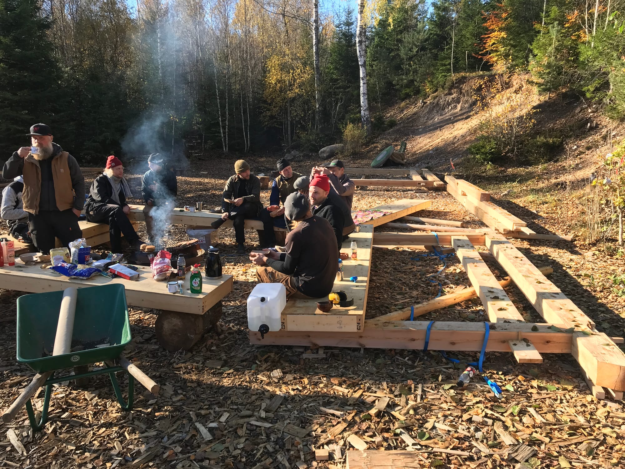Vi har varit på plats i Unnaryd fyra gånger under loppet av ett år. I augusti 2024 möttes vi på platsen i Unnaryd, där vi testade de olika faciliteterna, planerade tidpunkten för träffen och bilade en del timmer till projektet. Sedan har vi träffats och tagit ned timmer i både november och mars, och i juni 2025 byggde vi bockar, förberedde timret och platsen.