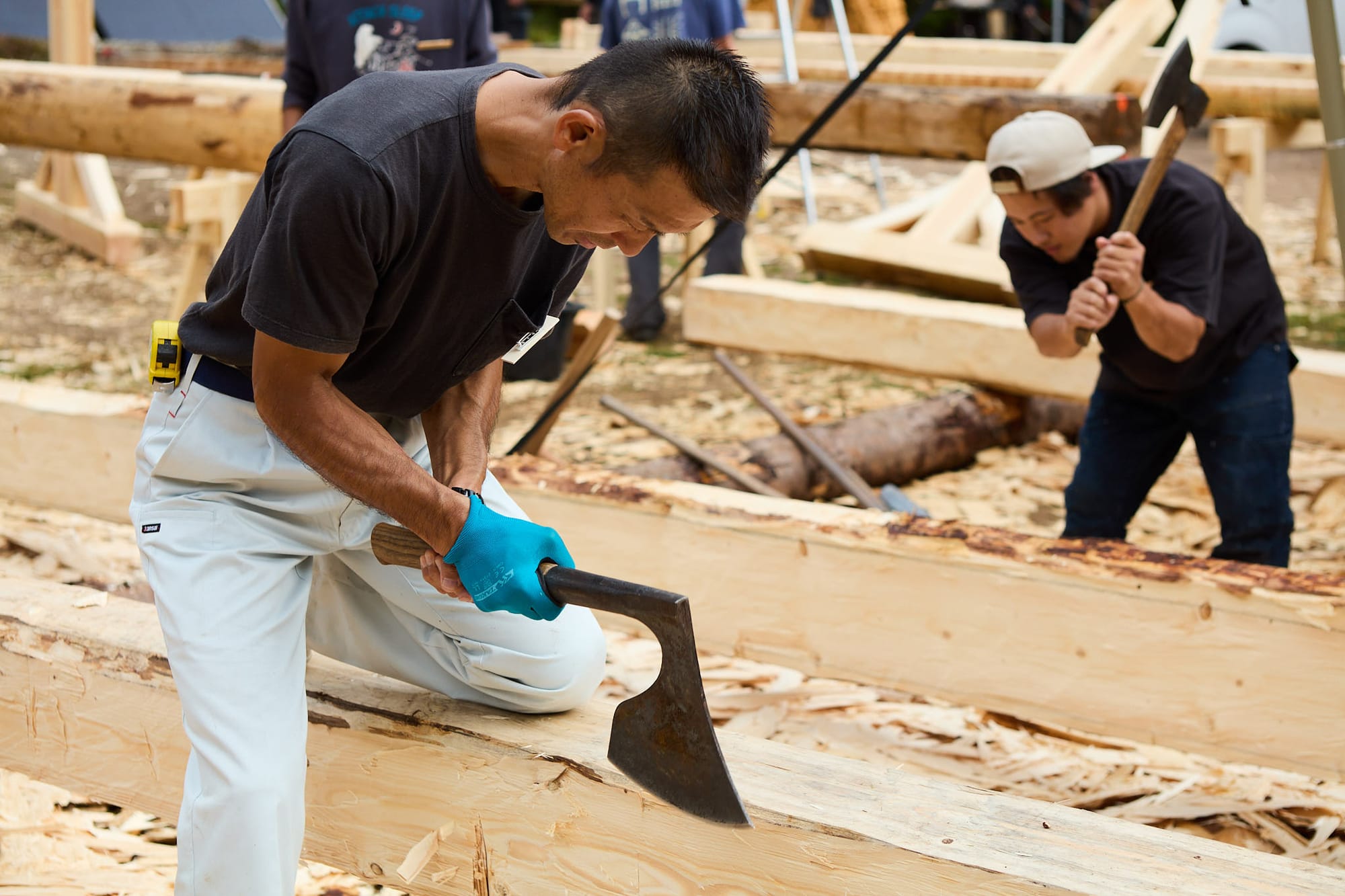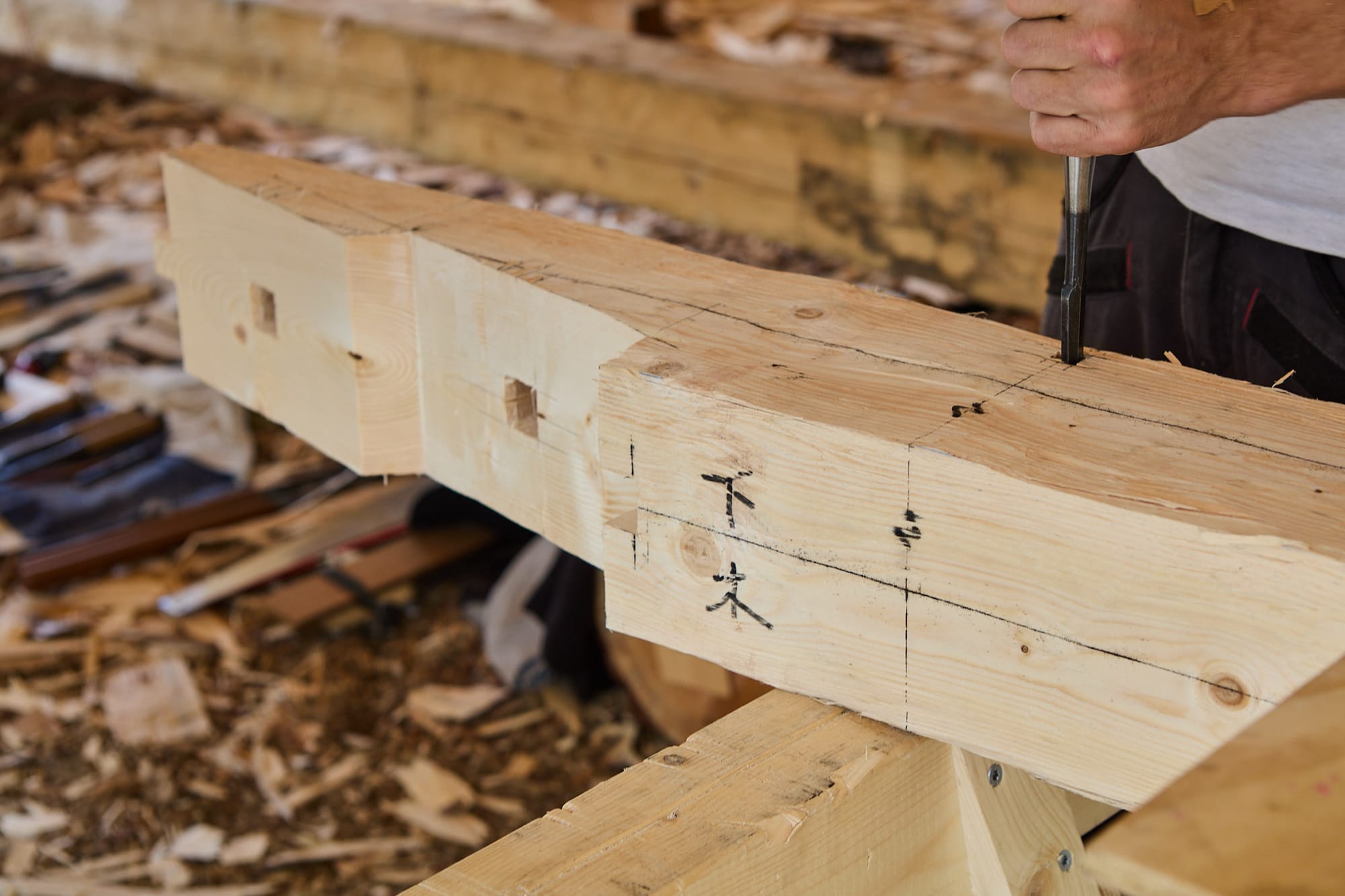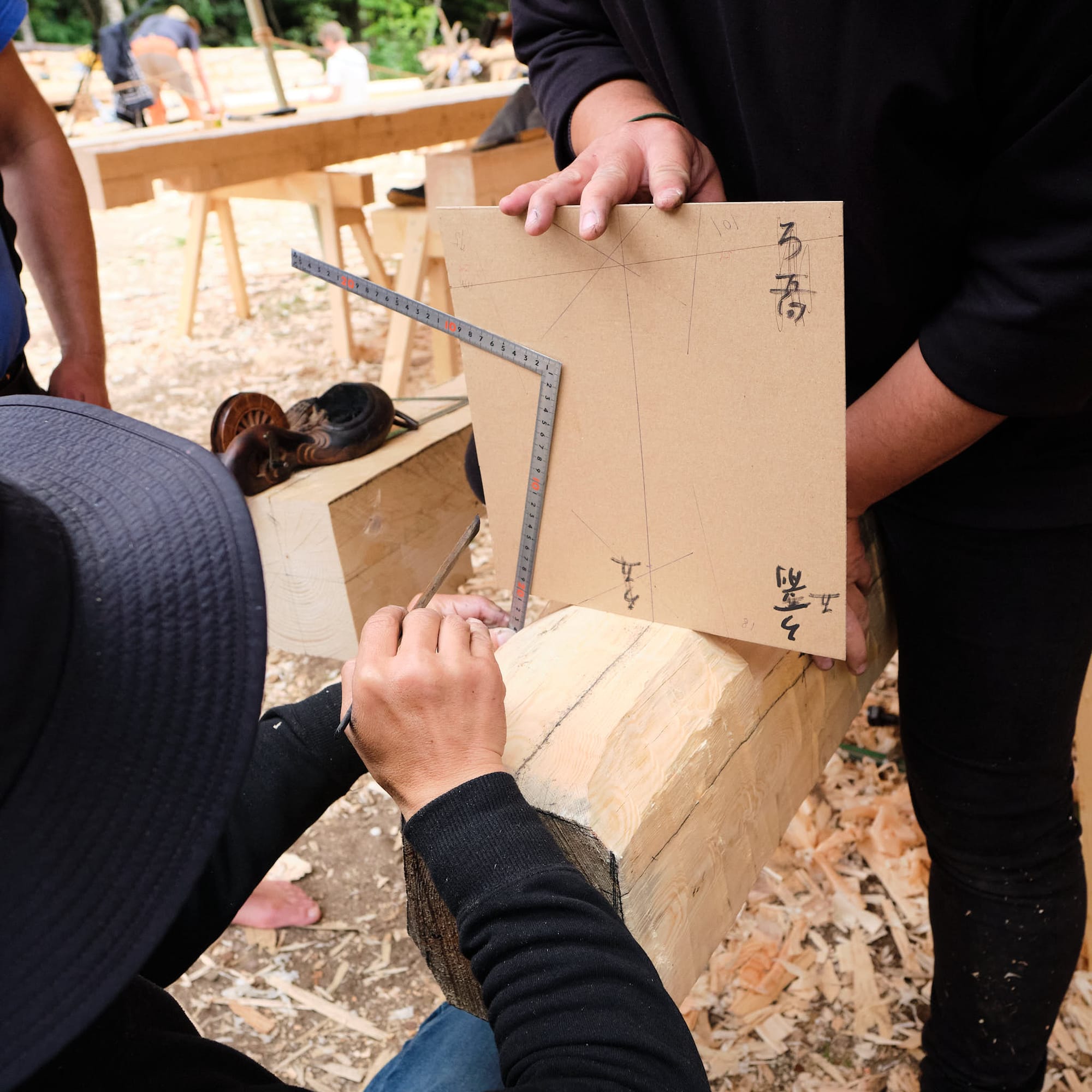 Vi hade beslutat att ha ett stort fokus på demonstrationer och förmedling av kunskaper under hela byggprocessen och med praktiska demonstrationer på kvällarna. Byggnaden hade vi försökt designa så att det skulle gå att kombinera både europeisk och japansk layout och påritningsmetoder. Vi använde därför centerlinjer som referens på alla delar i konstruktionen, så att vi kunde vara någorlunda säkra på att den japanska takkonstruktionen, bindbjälkar och yttervägg skulle passa ihop med den europeiska högremskonstruktionen. Enligt den svenska traditionen gjorde vi all märkning med måttläkter och mallar för träförbindningarna, även om japanerna naturligtvis använde sin egen mall i påmärkningen, dvs den japanska vinkeln.