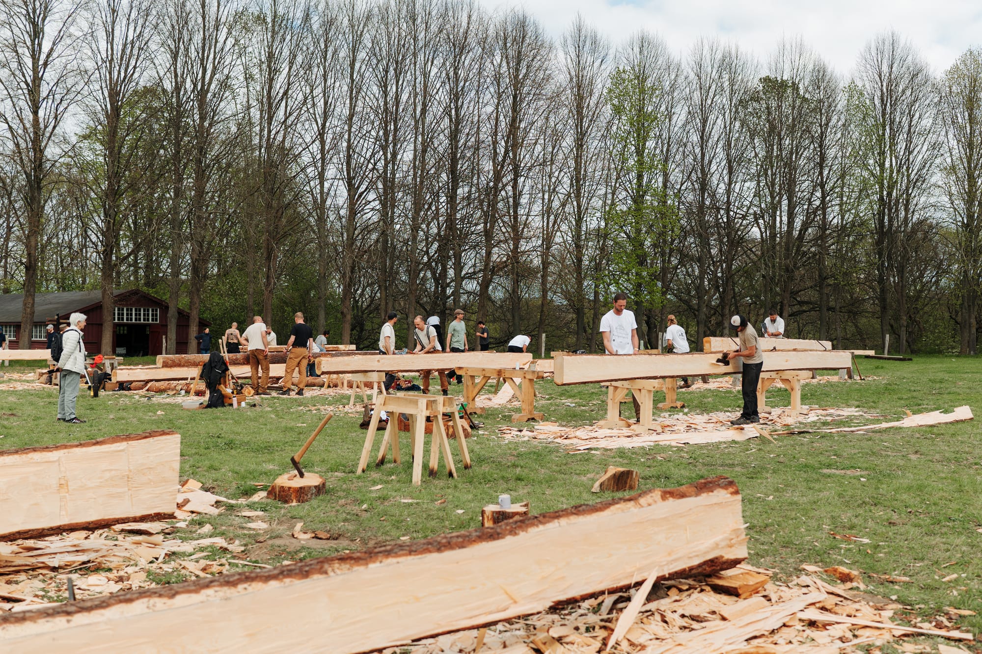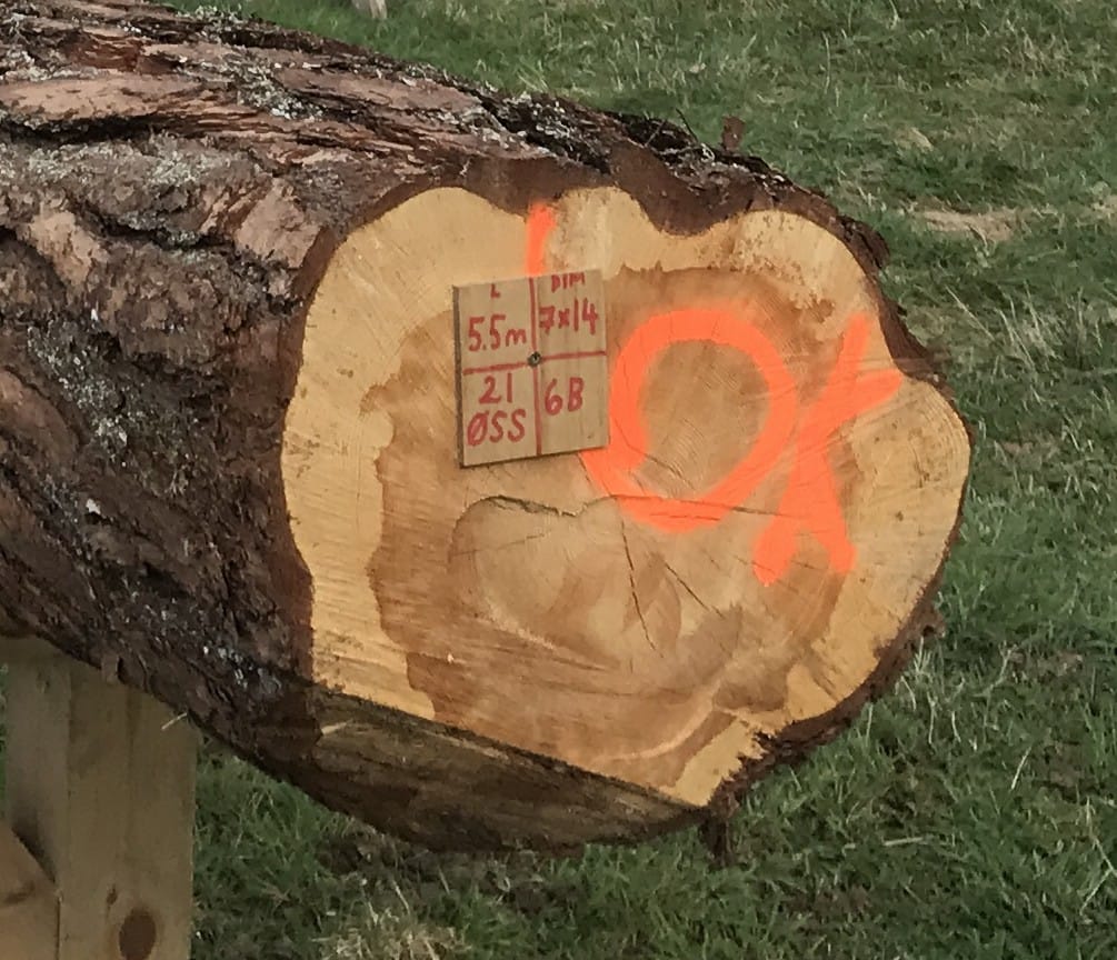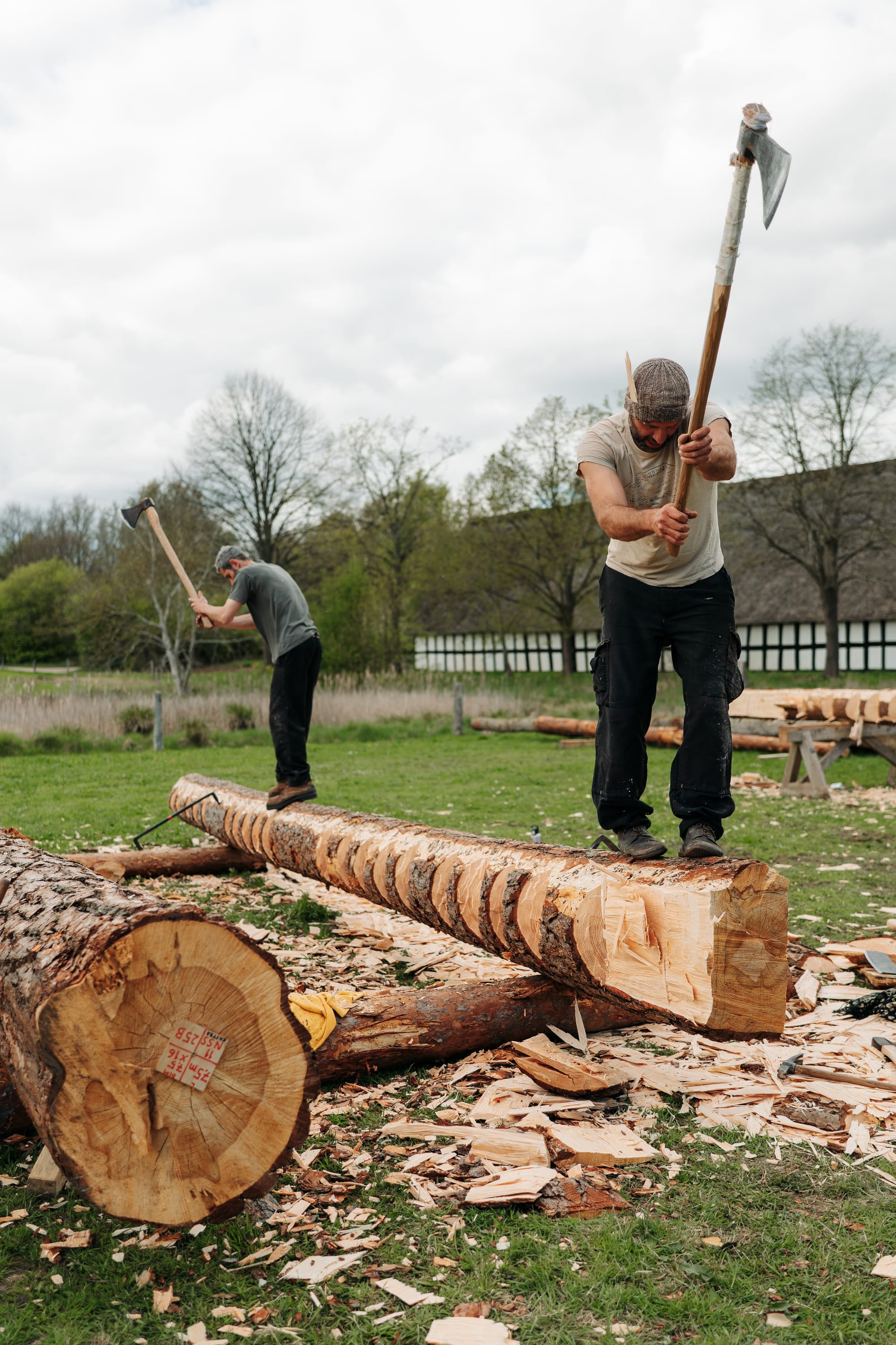 Februari 2025 fällde vi timmer i de sydsvenska skogarna där 5 träd fälldes med yxa och tillsammans med de andra 17 träd apterades i längder till specifika delar i konstruktionen. Allt timmer fick en ID-bricka, där info om längd, dimension, plats i konstruktionen och trädets plats i skogen. Totalt blev det 220 löpmeter timmer.