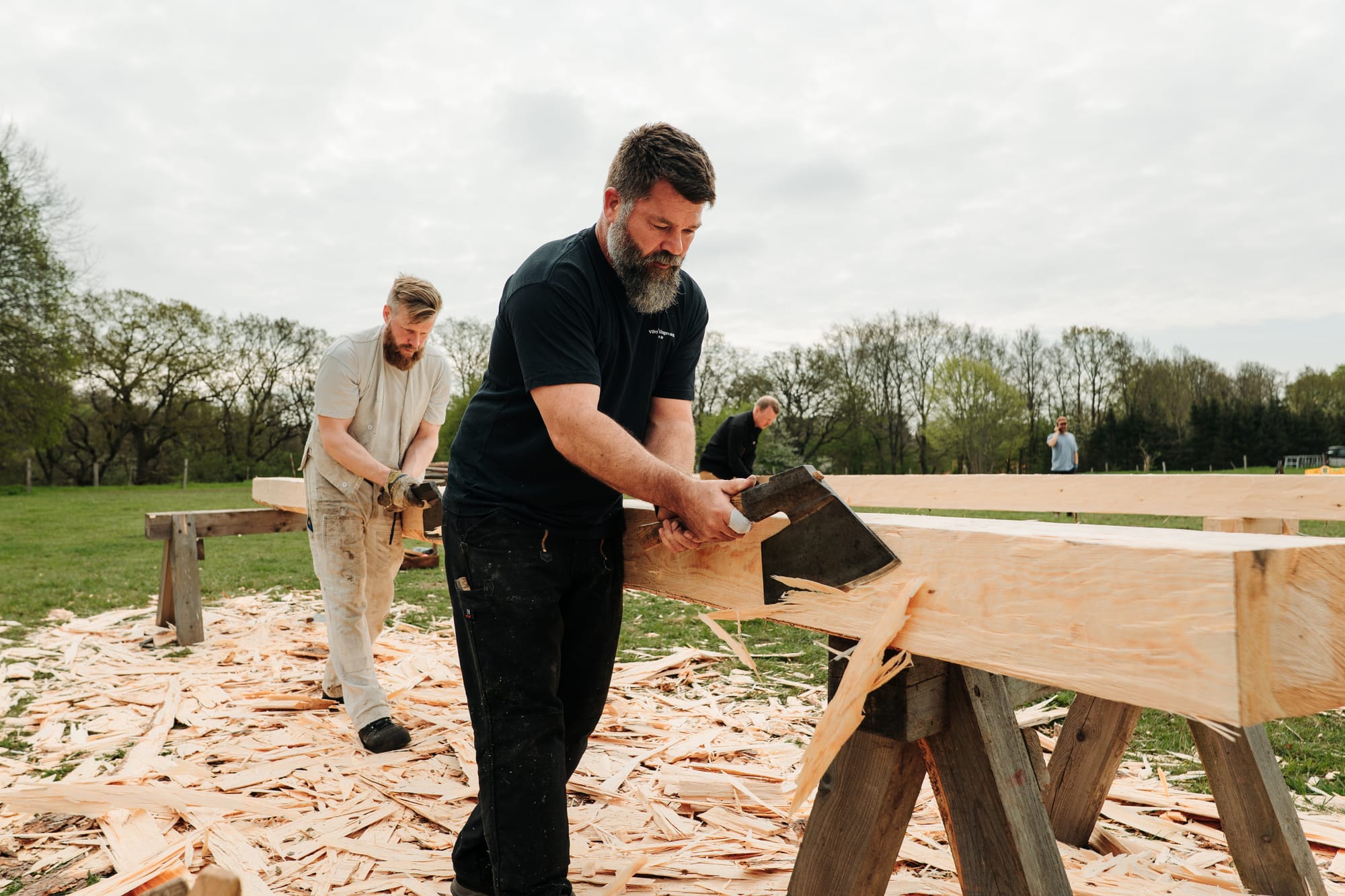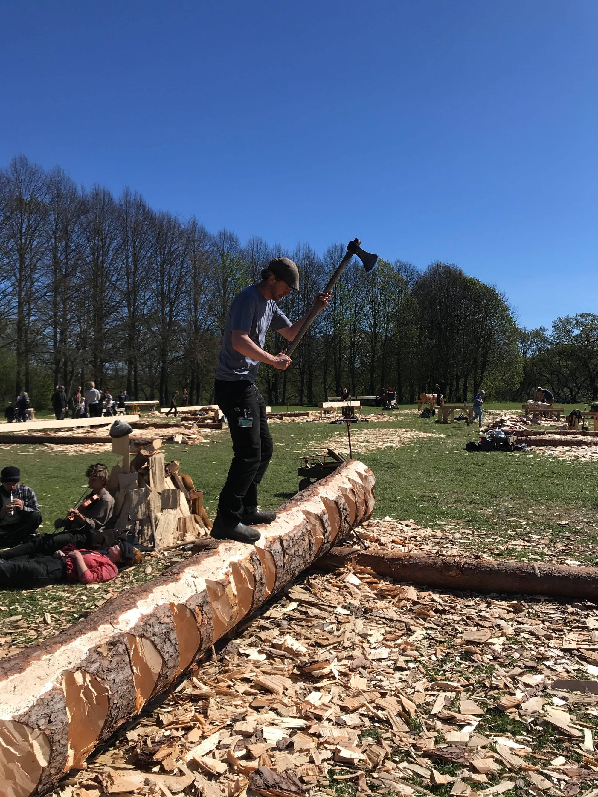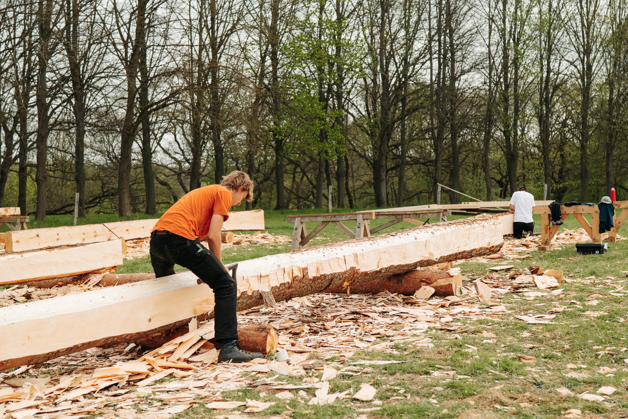 Februari 2025 fällde vi timmer i de sydsvenska skogarna där 5 träd fälldes med yxa och tillsammans med de andra 17 träd apterades i längder till specifika delar i konstruktionen. Allt timmer fick en ID-bricka, där info om längd, dimension, plats i konstruktionen och trädets plats i skogen. Totalt blev det 220 löpmeter timmer.