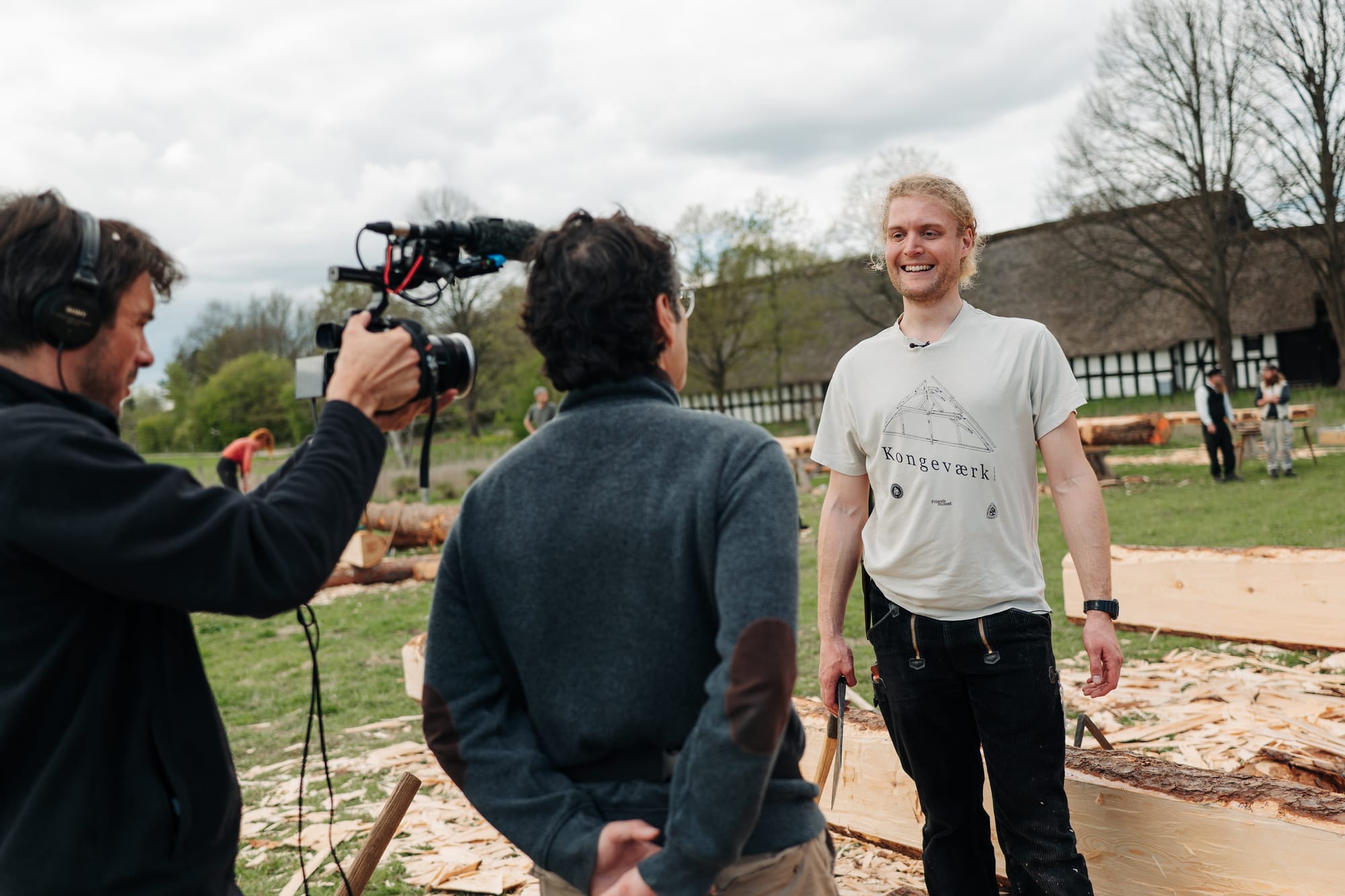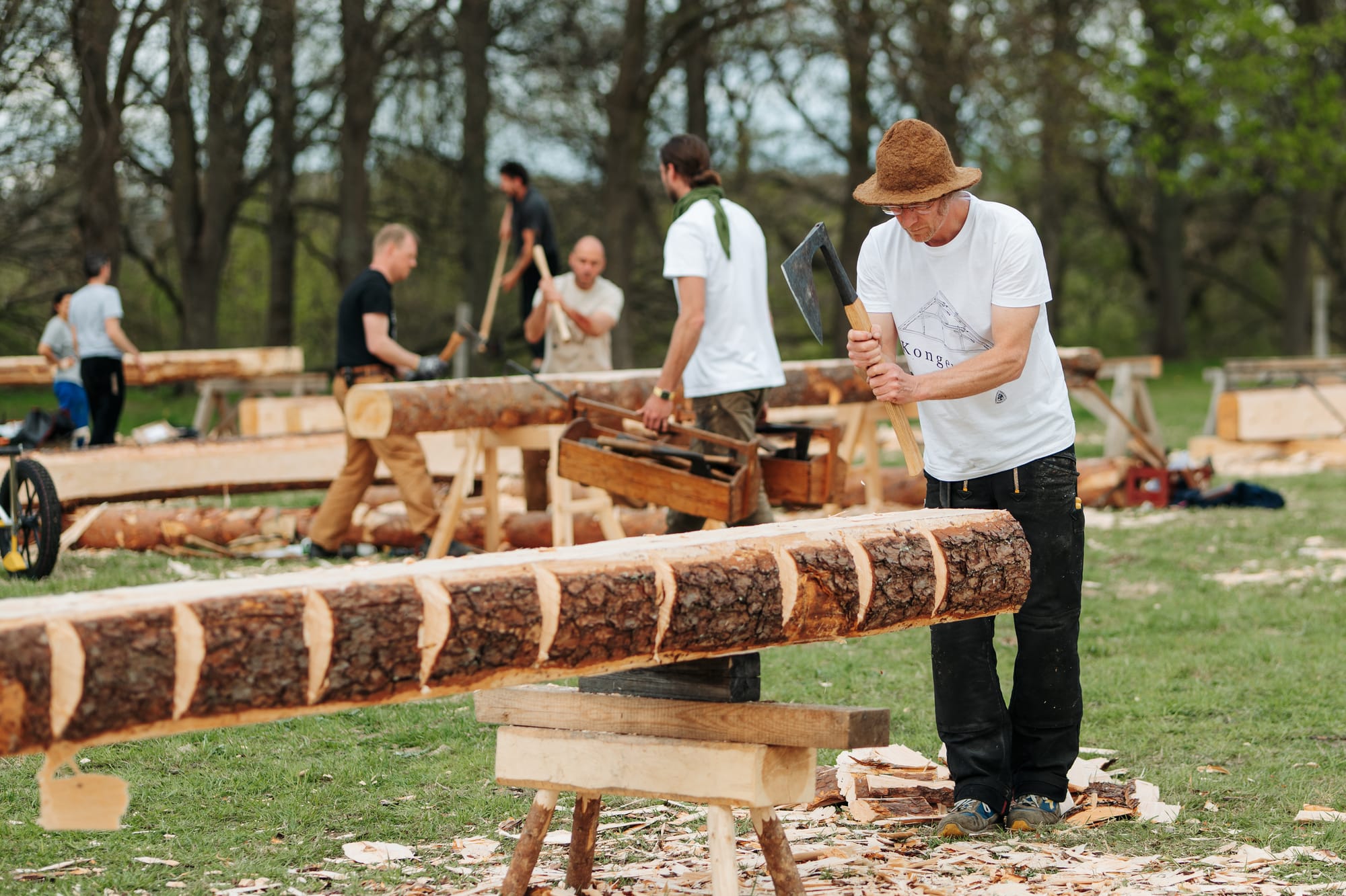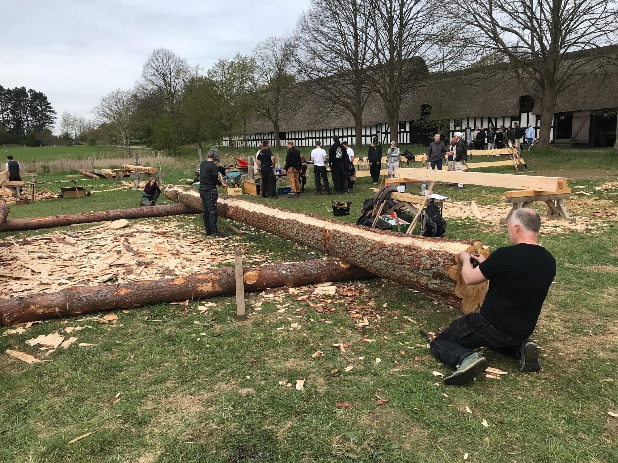 April 2025 träffades ca 40 hantverkare under 5 dagar på Frilandsmuseet och skrädde allt timmer till de dimensioner som uppmättes i takstol nr 11. Många olika yxtyper och huggtekniker användes och allt dokumenterades, så vi har koll på vilka tekniker och yxor som användes på vilka ytor.